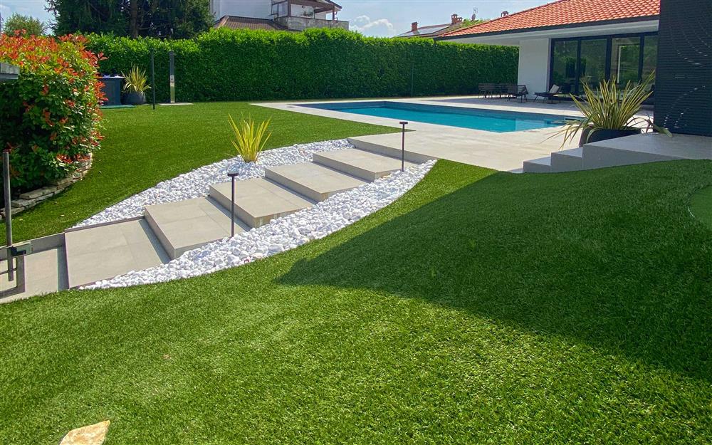 Per la pavimentazione, insieme all’erba sintetica, che può essere installata anche su balconi e terrazze, consigliamo il gres porcellanato. Si distingue per le proprietà antiscivolo e la varietà di realizzazioni, da valutare in relazione agli altri elementi di arredo e allo stile dell’immobile.